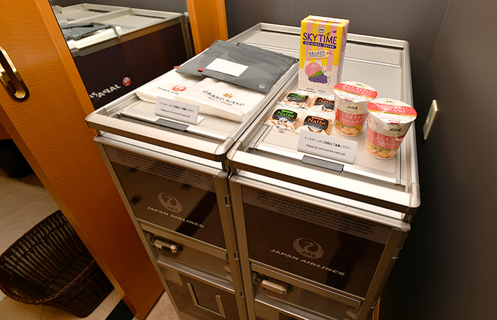 カートを設置するグランドニッコー東京とJALのコラボルーム「JAL FLIGHT & RED SUITE」のベッドルーム=23年6月27日 PHOTO: Yusuke KOHASE/Aviation Wire