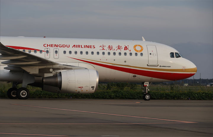 茨城空港へ到着する成都航空の福州-茨城チャーター(ACJ提供)