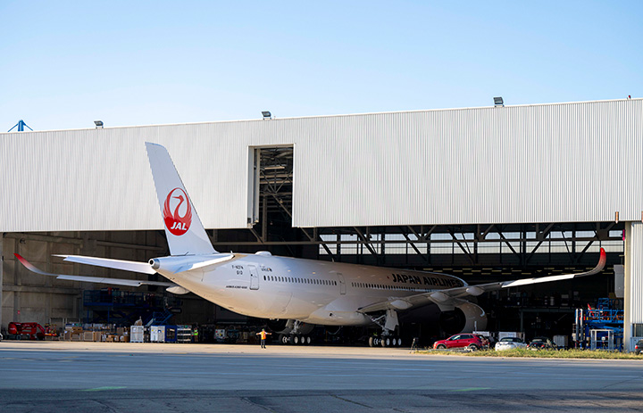 仏トゥールーズでロールアウトするJALのA350-1000初号機=23年10月10日 PHOTO: Frederic Lancelot, master films/Airbus