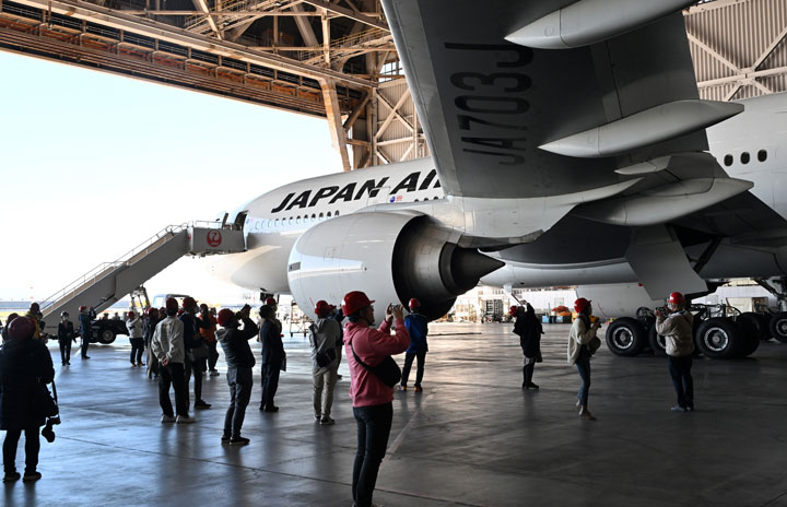 羽田空港のJAL格納庫で退役整備中の777-200ER JA703Jを見学するファイナルツアー参加者=23年11月19日 PHOTO: Tadayuki YOSHIKAWA/Aviation Wire