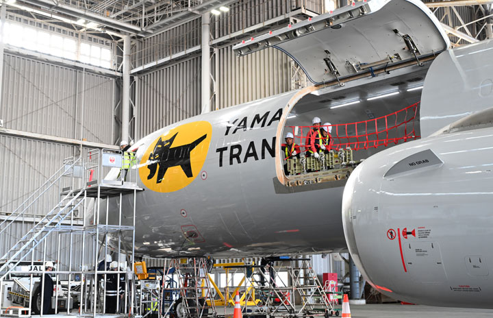 成田空港のJAL格納庫で上部貨物室ドアを開けるヤマトのA321ceo P2F貨物機=23年11月20日 PHOTO: Tadayuki YOSHIKAWA/Aviation Wire