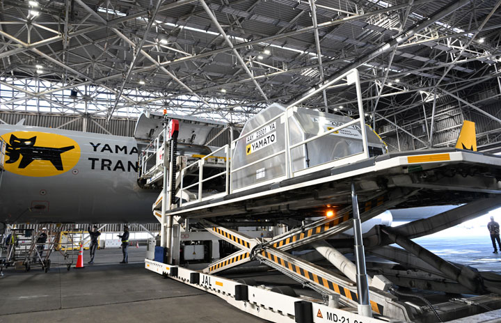 成田空港のJAL格納庫で上部貨物室にAAYコンテナを積み込むヤマトのA321ceo P2F貨物機=23年11月20日 PHOTO: Tadayuki YOSHIKAWA/Aviation Wire