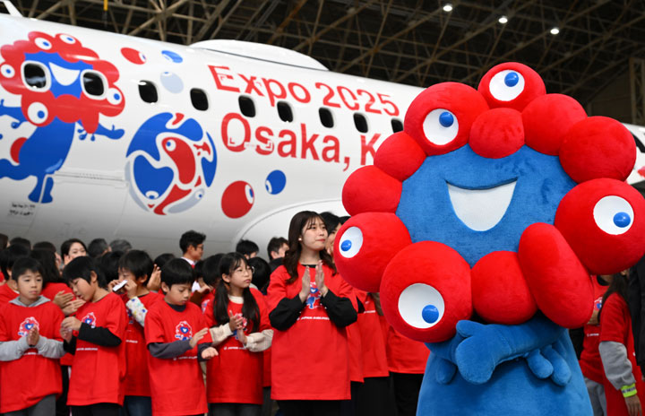 伊丹空港でお披露目されたJALミャクミャクJET=23年11月28日 PHOTO: Tadayuki YOSHIKAWA/Aviation Wire