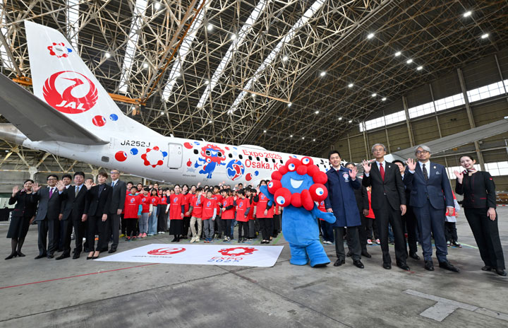 伊丹空港でJALミャクミャクJETをお披露目する吉村大阪府知事ら=23年11月28日 PHOTO: Tadayuki YOSHIKAWA/Aviation Wire