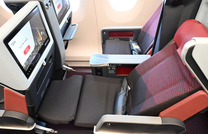 クラス初の電動リクライニングシートを採用したJAL A350-1000初号機のプレミアムエコノミークラス=23年12月13日 PHOTO: Tadayuki YOSHIKAWA/Aviation Wire