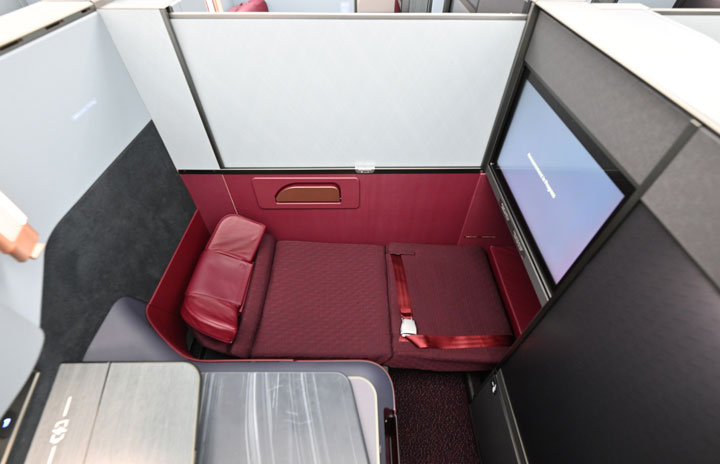 ベッドポジションでヘッドレストを少し起こしたJAL A350-1000初号機の個室ビジネスクラス=23年12月13日 PHOTO: Tadayuki YOSHIKAWA/Aviation Wire