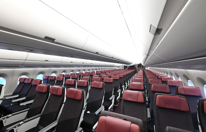トゥールーズで報道関係者に初公開されたJALのA350-1000初号機のエコノミークラス=23年12月13日 PHOTO: Tadayuki YOSHIKAWA/Aviation Wire