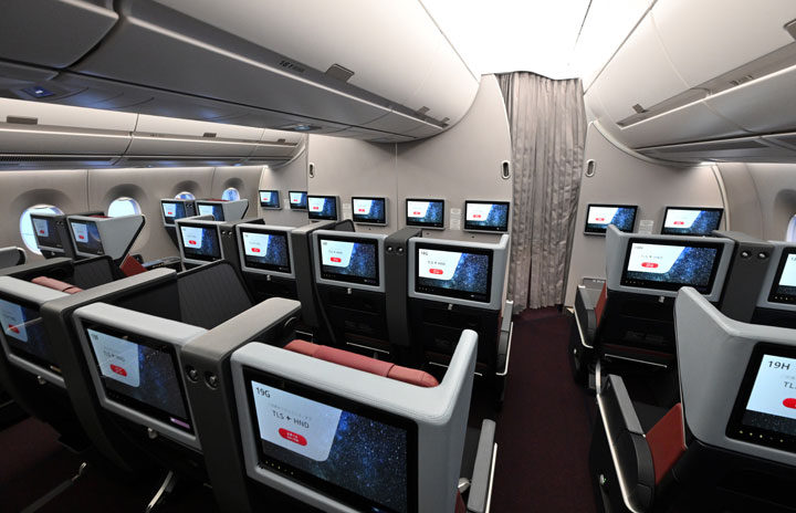 16インチの4Kモニターを備えるJAL A350-1000初号機のプレミアムエコノミークラス=23年12月13日 PHOTO: Tadayuki YOSHIKAWA/Aviation Wire