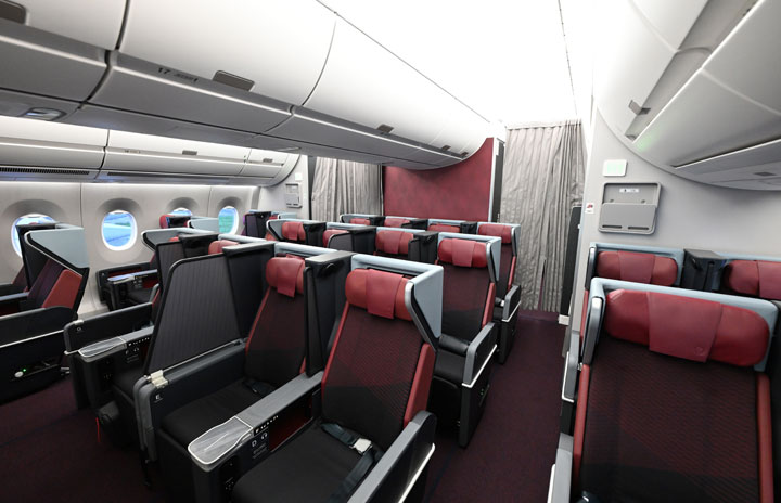 トゥールーズで報道関係者に初公開されたJALのA350-1000初号機のプレミアムエコノミークラス=23年12月13日 PHOTO: Tadayuki YOSHIKAWA/Aviation Wire