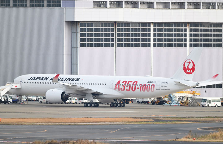 機体後部に赤いロゴが描かれた羽田空港に駐機中のJALのA350-1000初号機=23年12月27日 PHOTO: Tadayuki YOSHIKAWA/Aviation Wire