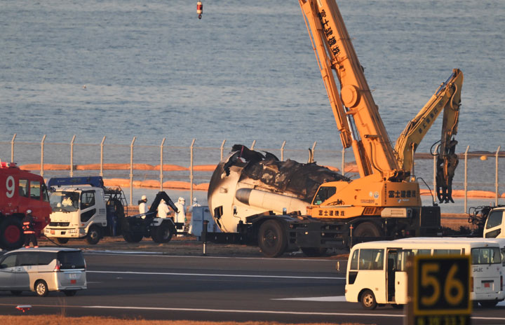 JAL A350-900 JA13XJの右エンジンの撤去作業が進む羽田C滑走路=24年1月6日16時8分 PHOTO: Tadayuki YOSHIKAWA/Aviation Wire