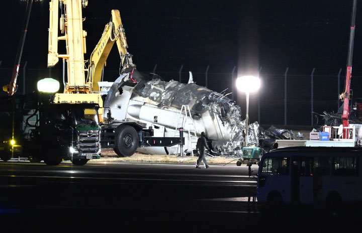 JAL A350-900 JA13XJの撤去作業が進む羽田C滑走路=24年1月6日19時54分 PHOTO: Tadayuki YOSHIKAWA/Aviation Wire