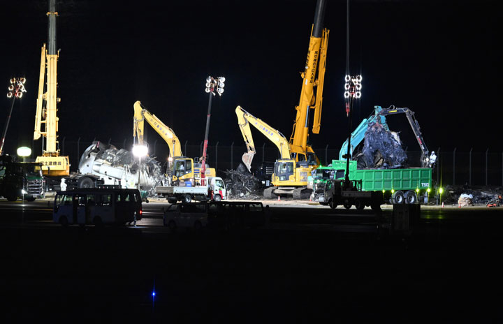 JAL A350-900 JA13XJの撤去作業が進む羽田C滑走路=24年1月6日20時11分 PHOTO: Tadayuki YOSHIKAWA/Aviation Wire