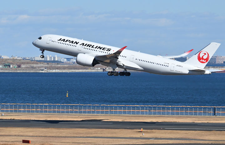 羽田空港C滑走路を離陸するJALの札幌行きJL513便のA350-900 JA09XJ=24年1月8日 PHOTO: Tadayuki YOSHIKAWA/Aviation Wire