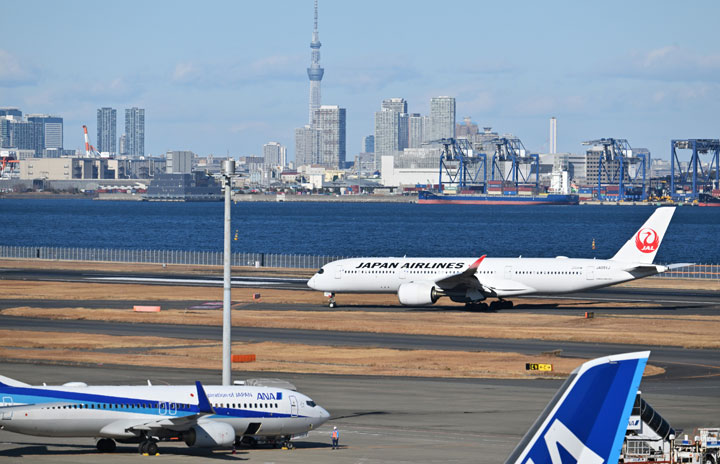 羽田空港C滑走路に着陸したJALの札幌発JL506便のA350-900 JA05XJ(奥)=24年1月8日 PHOTO: Tadayuki YOSHIKAWA/Aviation Wire