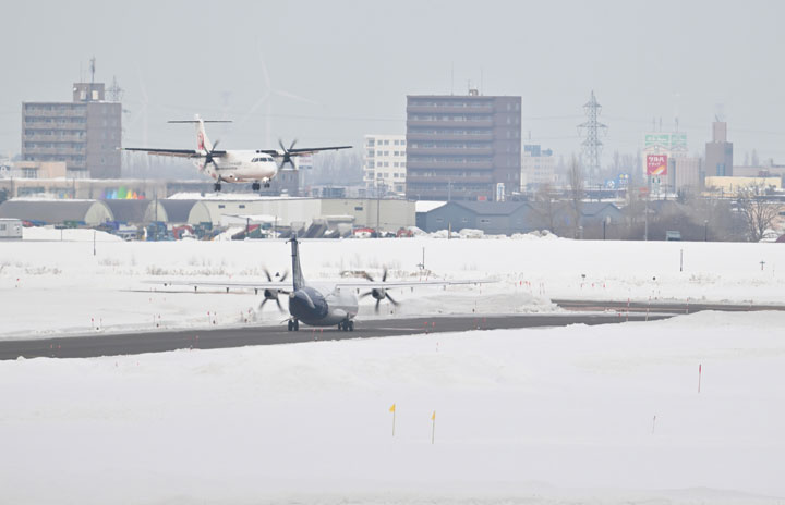 丘珠空港の滑走路手前で待機するトキエアの新潟行き初便BV102便(下)と着陸する北海道エアシステムの根室中標津発JL2732便=24年1月31日 PHOTO: Tadayuki YOSHIKAWA/Aviation Wire