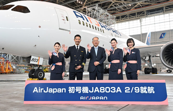 AirJapan便に投入する787-8を披露するエアージャパンの峯口秀喜社長とパイロット、客室乗務員=24年2月6日 PHOTO: Tadayuki YOSHIKAWA/Aviation Wire