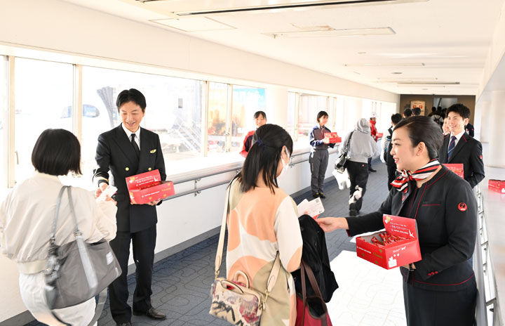 羽田空港で那覇行きJL909便の乗客にバレンタインデーのチョコレートをプレゼントするJALの客室乗務員ら=24年2月14日 PHOTO: Tadayuki YOSHIKAWA/Aviation Wire
