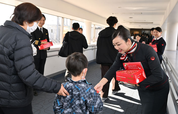 羽田空港で那覇行きJL909便の乗客にバレンタインデーのチョコレートをプレゼントするJALの客室乗務員ら=24年2月14日 PHOTO: Tadayuki YOSHIKAWA/Aviation Wire