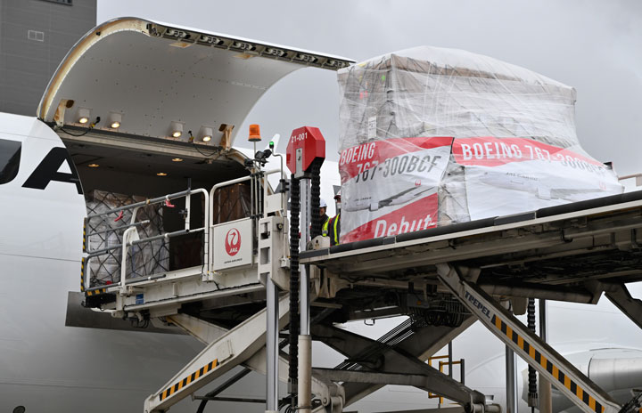 成田空港で出発を待つJALの767-300BCF初便の台北行きJL6719便に搭載される就航記念デザインが施された貨物=24年2月19日 PHOTO: Tadayuki YOSHIKAWA/Aviation Wire