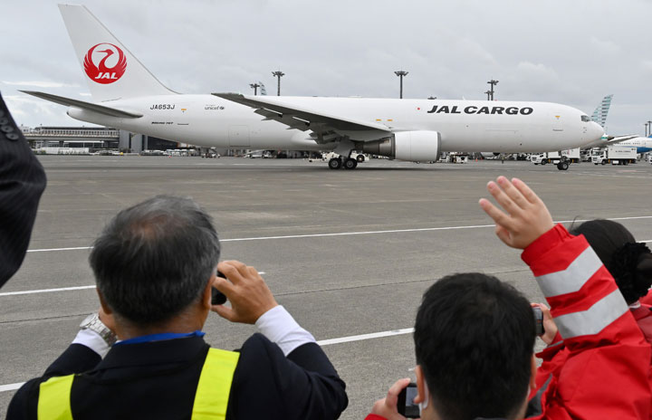 JAL社員らに見送られて成田空港を出発するJALの767-300BCF初便台北行きJL6719便=24年2月19日 PHOTO: Tadayuki YOSHIKAWA/Aviation Wire