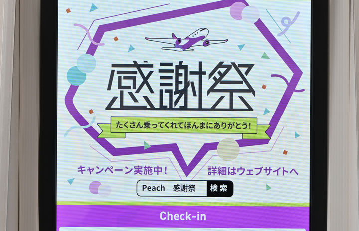 ピーチのチェックイン機に表示された就航記念日に始めたセール「感謝祭」の告知=24年3月1日 PHOTO: Tadayuki YOSHIKAWA/Aviation Wire
