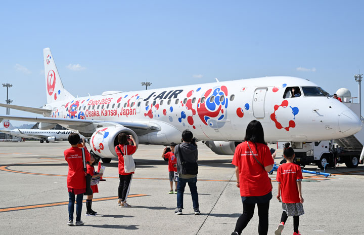 伊丹空港で出発を待つJALミャクミャクJETチャーター=24年4月14日 PHOTO: Tadayuki YOSHIKAWA/Aviation Wire