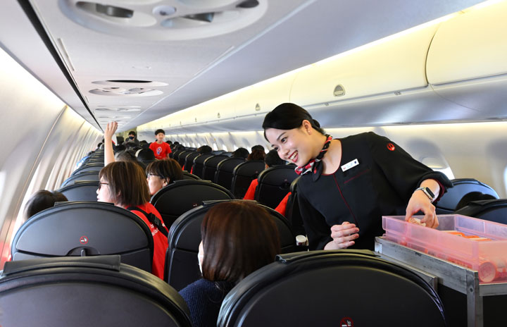 JALミャクミャクJETチャーターで機内サービスする客室乗務員の大廻さん=24年4月14日 PHOTO: Tadayuki YOSHIKAWA/Aviation Wire