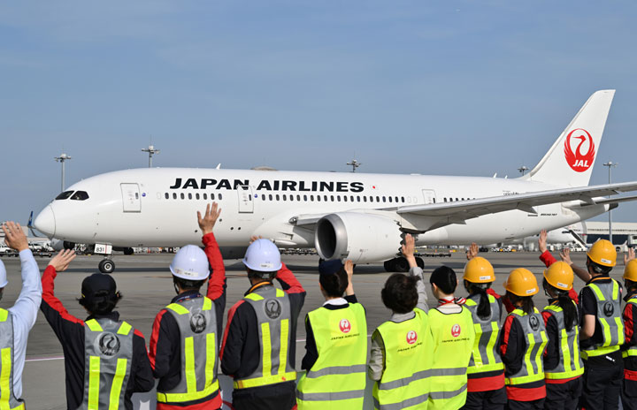 東京-ソウル就航60周年を記念し羽田発ソウル金浦行きJL93便を見送るJAL社員ら=24年4月15日 PHOTO: Tadayuki YOSHIKAWA/Aviation Wire
