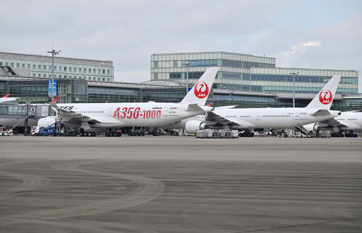 羽田空港に並ぶJALのA350-1000 2号機JA02WJと777-300ER JA734J=24年4月17日 PHOTO: Tadayuki YOSHIKAWA/Aviation Wire