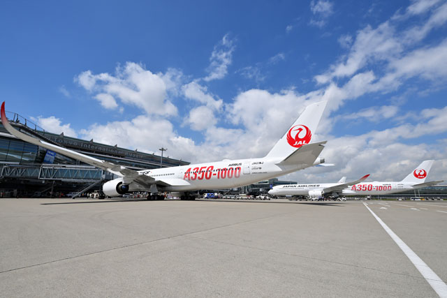 羽田空港で出発を待つJALのA350-1000ダラス線投入初便のJL12便(手前、初号機JA01WJ)と赤いロゴのデカールを貼ったばかりの2号機JA02WJによるニューヨーク行きJL6便=24年4月17日 PHOTO: Tadayuki YOSHIKAWA/Aviation Wire