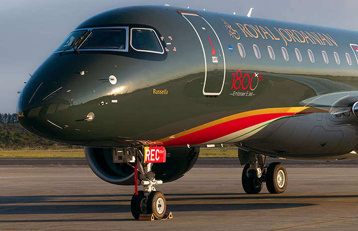 1800機目のEジェットとなったロイヤル・ヨルダン航空のE190-E2(エンブラエル提供)