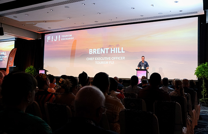 「フィジー・ツーリズム・エクスチャンジ2024」でプレゼンするフィジー政観のヒルCEO(同政観提供)
