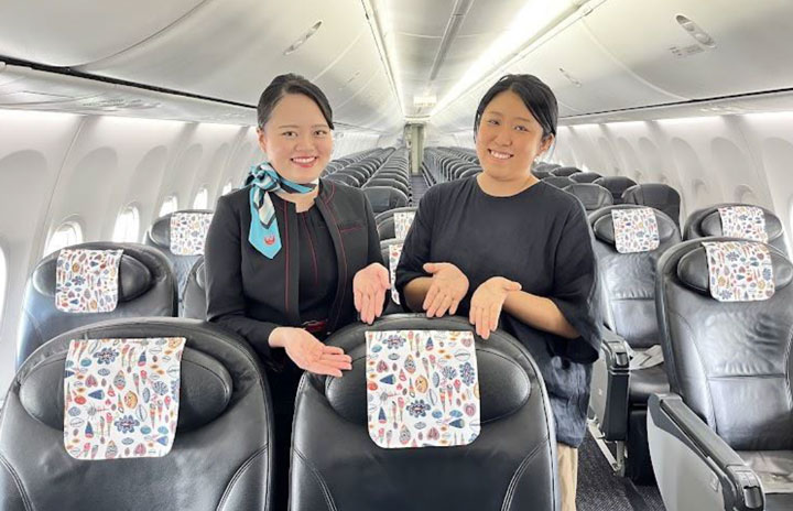 JTAのクラスJ用ヘッドレストカバーをデザインした紅型工房ひがしやの道家由利子さん(右、同社提供)