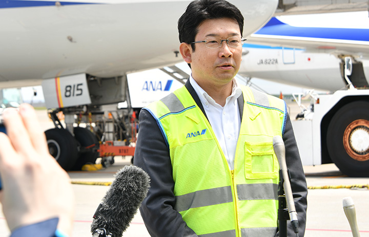 RDの実証を説明するANAの乾マネジャー=24年5月9日 PHOTO: Yusuke KOHASE/Aviation Wire