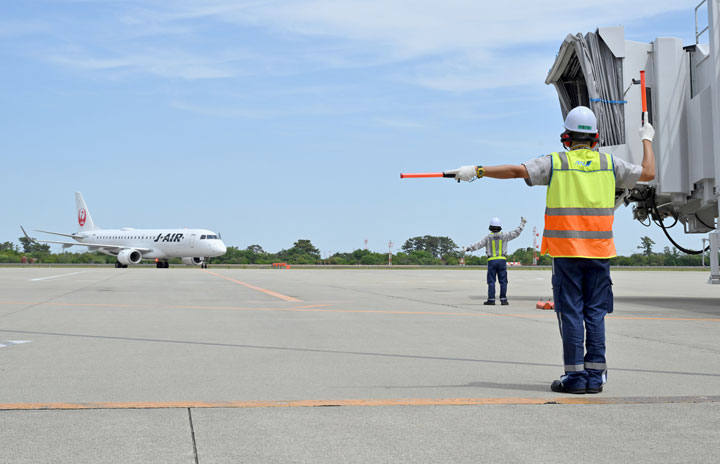 グラハン資格の相互承認でマーシャリング資格を取得し、仙台空港でANAのビブスを着用してJAL便をスポットへ誘導する日通の千葉晃史さん=24年5月14日 PHOTO: Tadayuki YOSHIKAWA/Aviation Wire