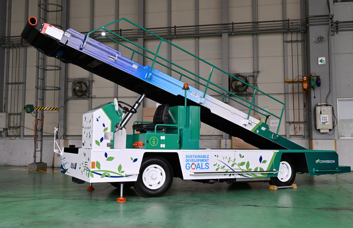 全日空モーターサービスがディーゼル車からEV化したベルトローダー=24年5月20日 PHOTO: Tadayuki YOSHIKAWA/Aviation Wire