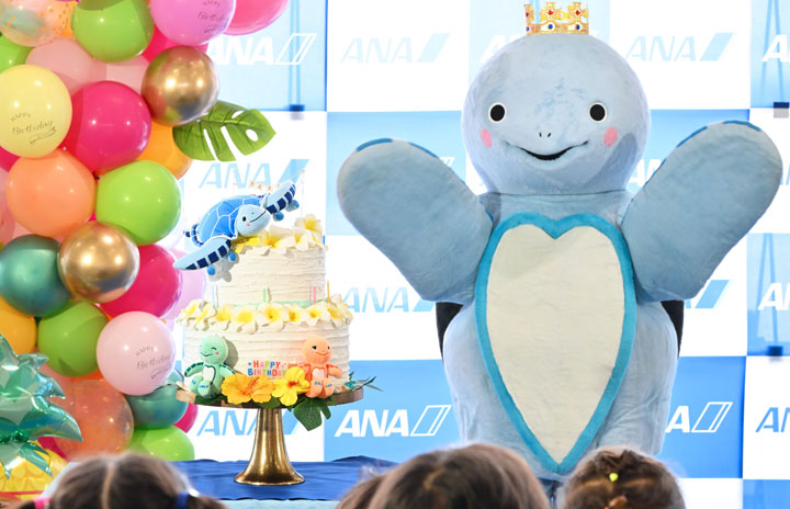 成田空港で開かれたANAのA380就航5周年記念式典で5歳の誕生日を祝うダミーのバースデーケーキを贈られたA380初号機のイメージキャラクター「ラニ」=24年5月24日 PHOTO: Tadayuki YOSHIKAWA/Aviation Wire