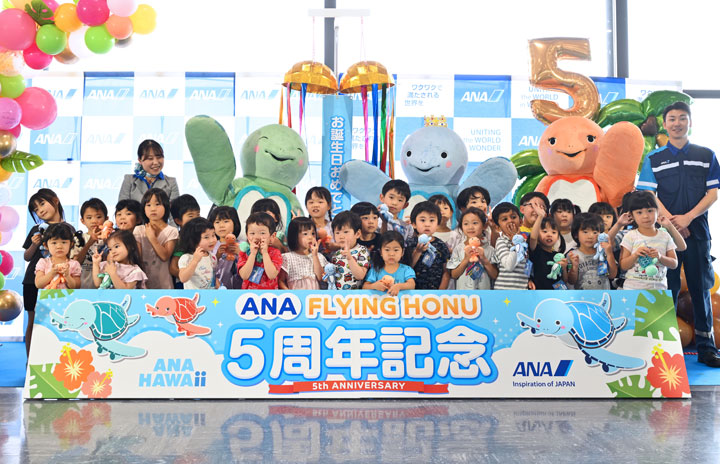 成田空港で開かれたANAのA380就航5周年記念式典で誕生日を祝福されるA380初号機のイメージキャラクターでブルーの「ラニ」(中央右)と2号機をイメージしたエメラルドグリーンの「カイ」(同左)、3号機をイメージしたオレンジの「ラー」(右)=24年5月24日 PHOTO: Tadayuki YOSHIKAWA/Aviation Wire