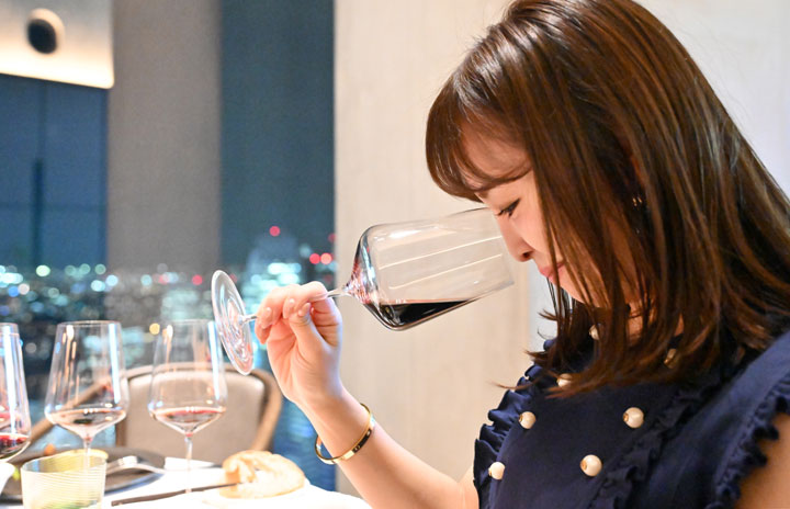 Restaurant Bellustarで開かれたJAL国際線ファーストクラスのワインを楽しむサントリーのメイカーズディナーに参加する女性=24年6月 PHOTO: Tadayuki YOSHIKAWA/Aviation Wire