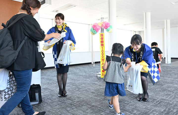 鹿児島空港で累計搭乗者数1000万人突破の記念品を羽田行きBC304便の乗客にプレゼントするスカイマークの係員=24年6月13日 PHOTO: Tadayuki YOSHIKAWA/Aviation Wire