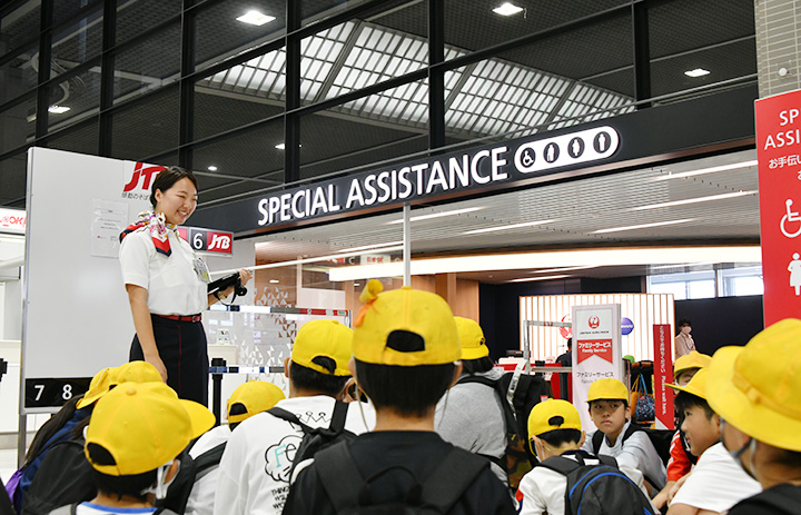 稲敷市の小学6年生に成田空港を案内するJALスカイの地上係員=24年6月24日 PHOTO: Yusuke KOHASE/Aviation Wire