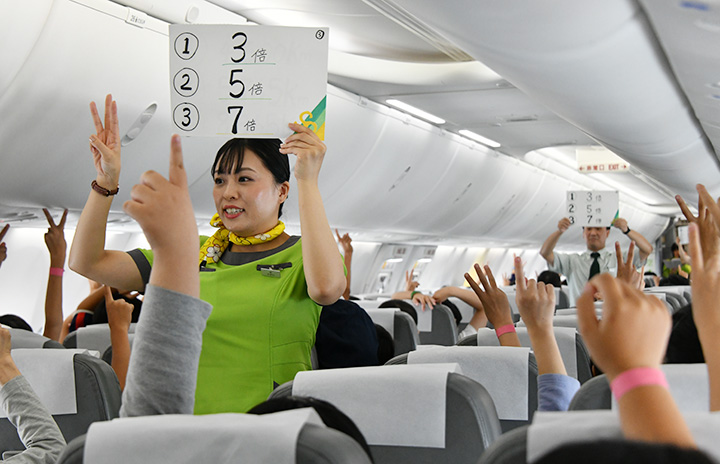 スプリング・ジャパンの周遊フライトIJ9174便でクイズを出題する客室乗務員=24年6月24日 PHOTO: Yusuke KOHASE/Aviation Wire