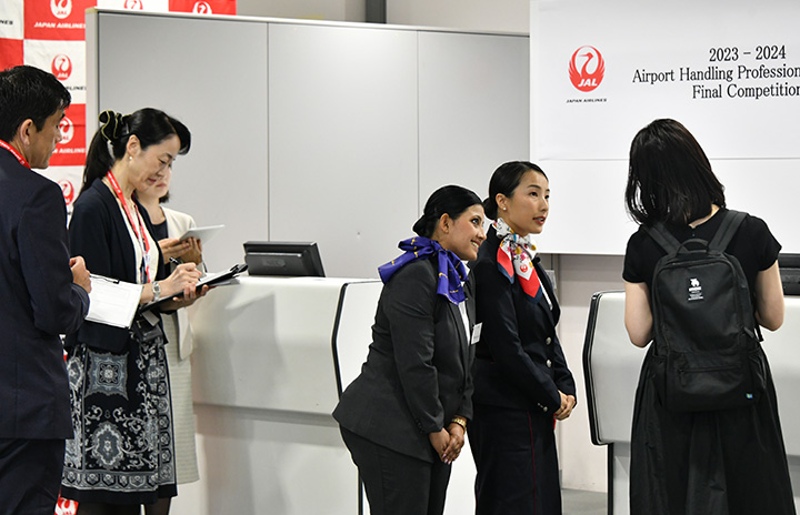 JALの「空港ハンドリング プロフェッショナルコンテスト」でロールプレイに挑むダラス空港チーム=24年6月27日 PHOTO: Yusuke KOHASE/Aviation Wire
