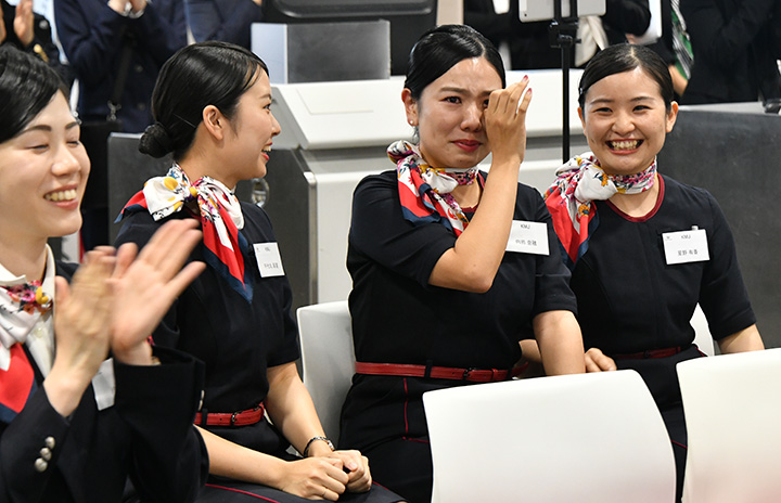 JALの「空港ハンドリング プロフェッショナルコンテスト」で優勝し涙をぬぐう熊本空港チームの内田さん(中)=24年6月27日 PHOTO: Yusuke KOHASE/Aviation Wire