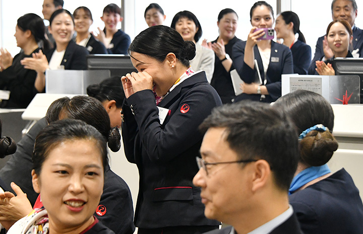 JALの「空港ハンドリング プロフェッショナルコンテスト」で優勝し涙をぬぐうダラス空港チームのWilliamsさん=24年6月27日 PHOTO: Yusuke KOHASE/Aviation Wire