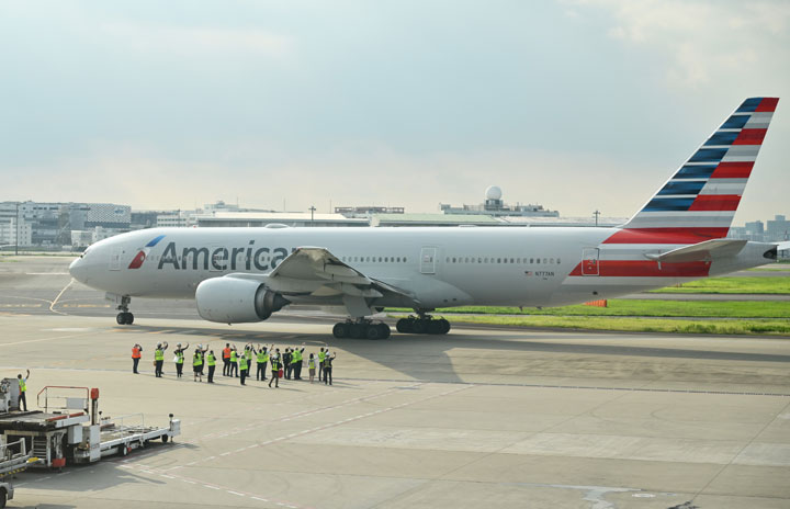 コックピットに日米両国の国旗を掲げて羽田を出発するアメリカン航空のニューヨーク行きAA168便=24年6月29日 PHOTO: Tadayuki YOSHIKAWA/Aviation Wire