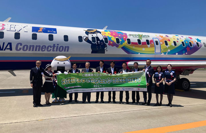 仙台空港でお披露目されたIBEXの3代目むすび丸ジェット(同社Xから)