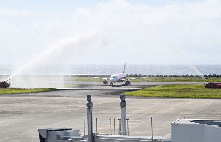 奄美空港で放水アーチの歓迎を受けて到着するピーチの成田発MM541便=24年7月1日 PHOTO: Tadayuki YOSHIKAWA/Aviation Wire