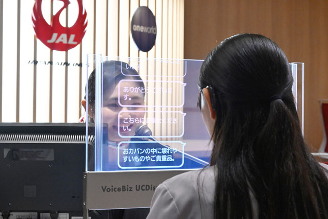 羽田空港で実施されたVoiceBiz UCDisplayの実証実験で聴覚障がいを持つ利用者役の社員(手前)と字幕でやり取りするJALのグランドスタッフ=24年7月2日 PHOTO: Tadayuki YOSHIKAWA/Aviation Wire